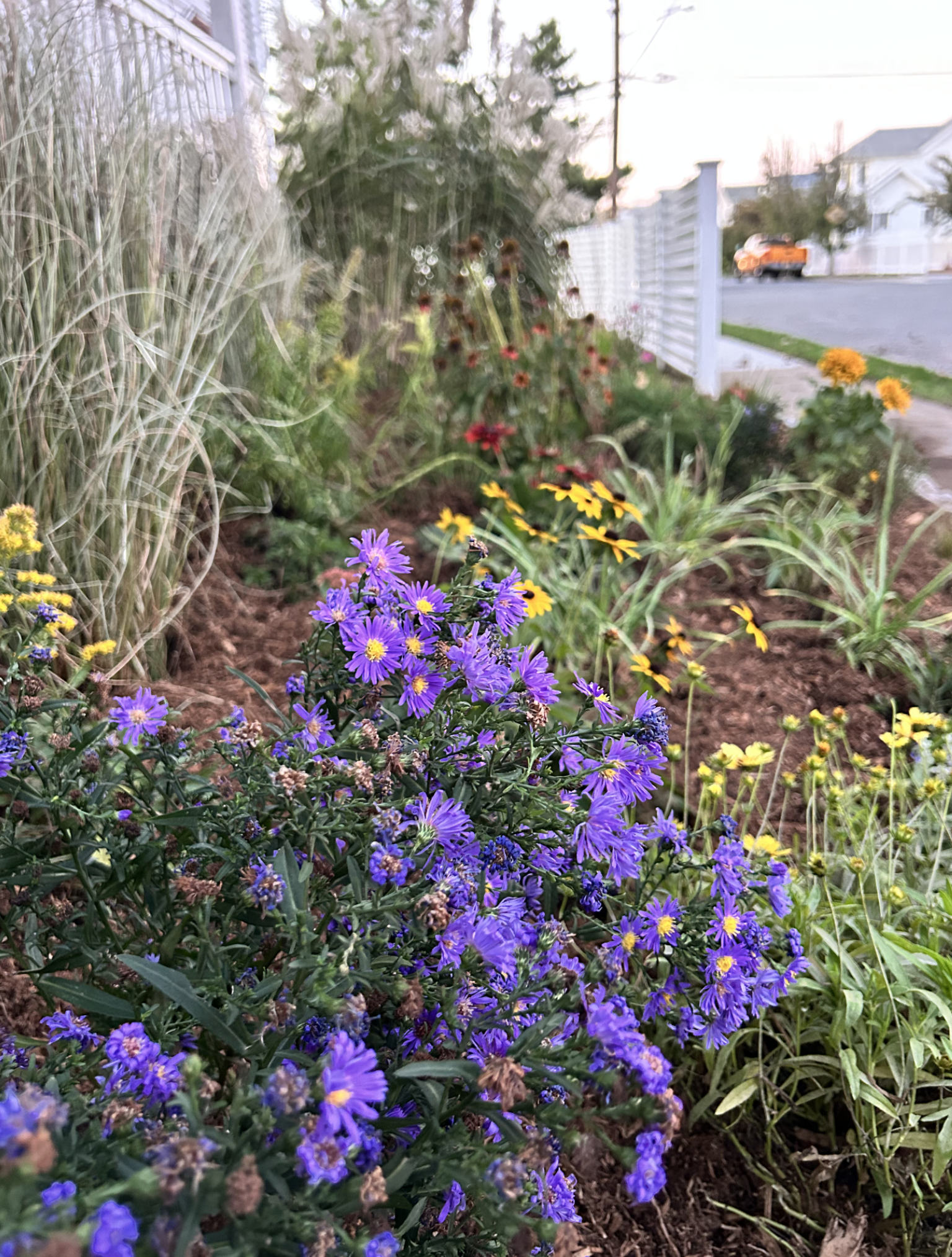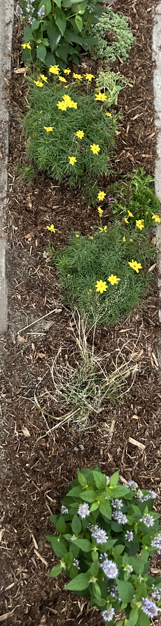 The project also extended beyond the main garden. A previously neglected hellstrip—once just dead grass—was transformed into a resilient planting of Coreopsis, Sedums, and ornamental grasses, bringing life and pollinator habitat to the street edge.